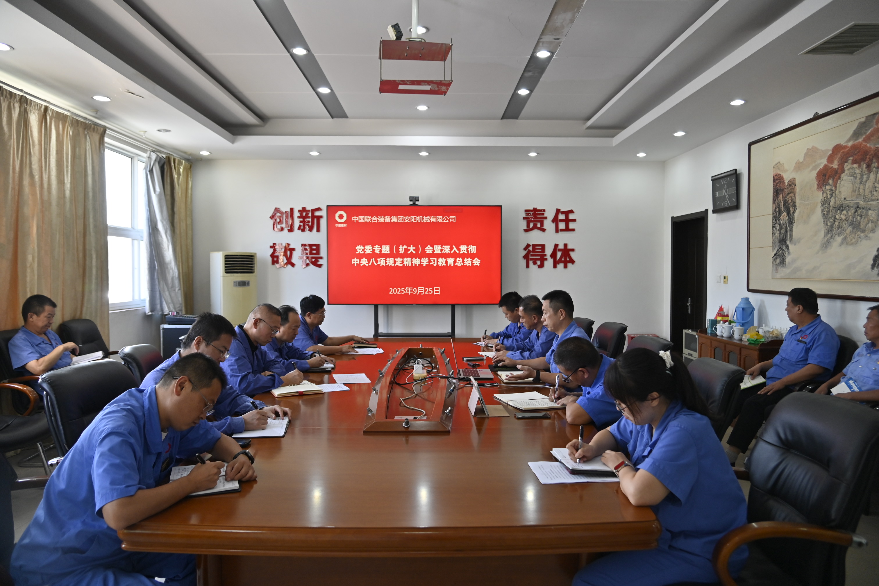9月25日,安陽機(jī)械召開黨委專題(擴(kuò)大)會(huì)暨深入貫徹中央八項(xiàng)規(guī)定精神學(xué)習(xí)教育總結(jié)會(huì)。會(huì)議傳達(dá)學(xué)習(xí)習(xí)近平總書記相關(guān)重要指示精神,以及中央、國(guó)務(wù)院國(guó)資委、中國(guó)建材集團(tuán)、凱盛集團(tuán)、中國(guó)聯(lián)合裝備黨委會(huì)議精神,全面回顧公司學(xué)習(xí)教育成效與經(jīng)驗(yàn),分析現(xiàn)存問題,并部署鞏固成果、推動(dòng)作風(fēng)建設(shè)常態(tài)化長(zhǎng)效化工作。公司黨委書記、董事孫興華主持會(huì)議并總結(jié)講話,黨委副書記、紀(jì)委書記陳志勇報(bào)告學(xué)習(xí)教育總體情況。
